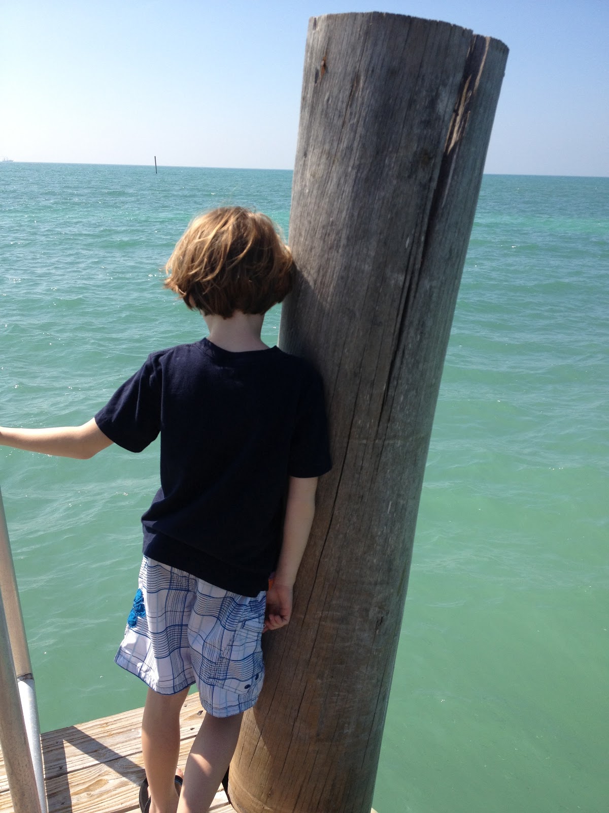 There are no waves in Key West because there is a reef five miles out, so there are no natural sandy beaches - all the sand is brought in from Miami. It makes for a really neat coastline . . flat rock where hundreds of shelled sea creatures collect . . . perfect for Pitts boy exploring!